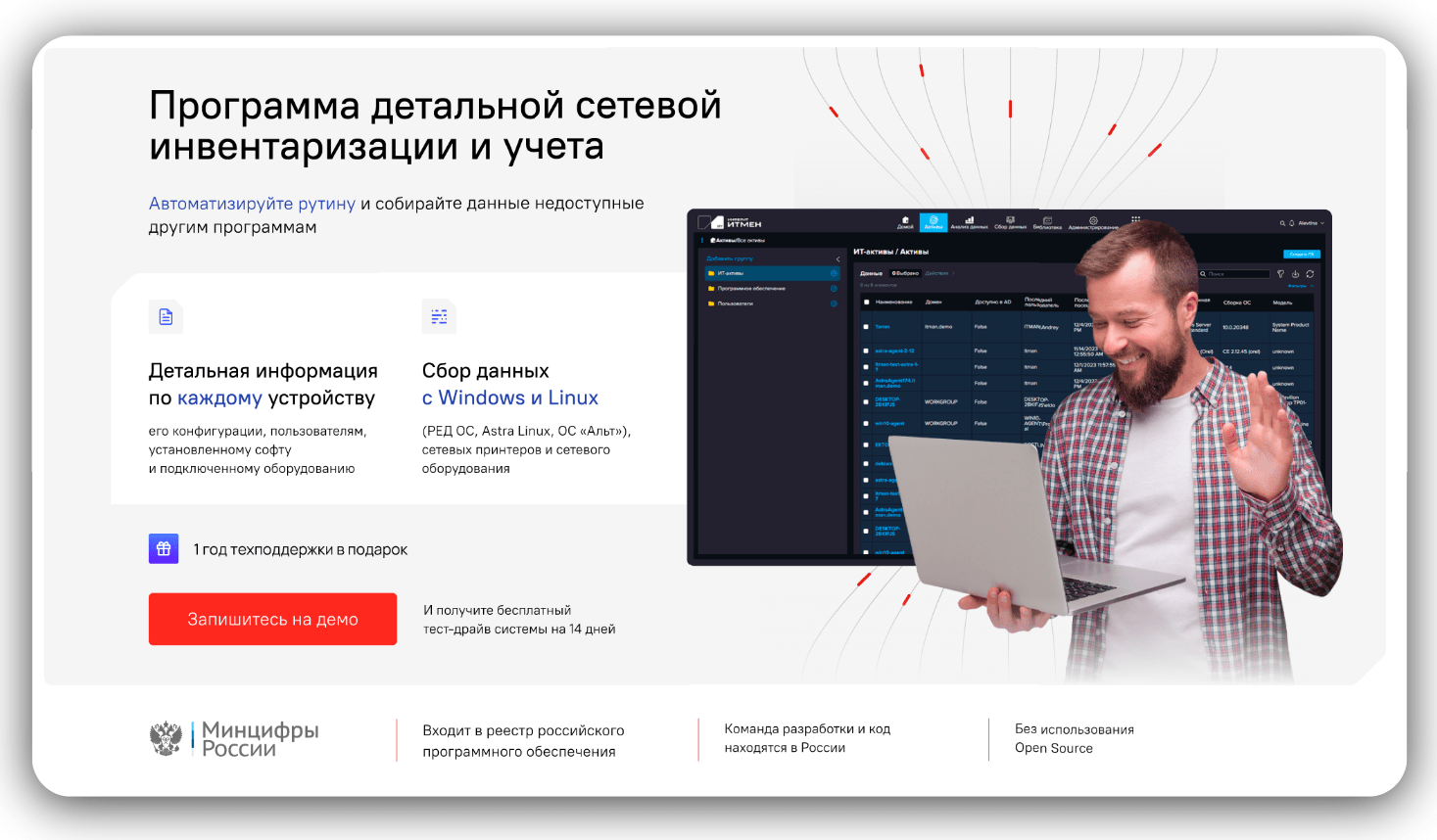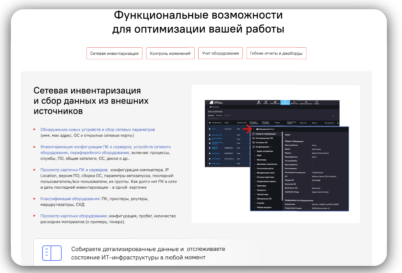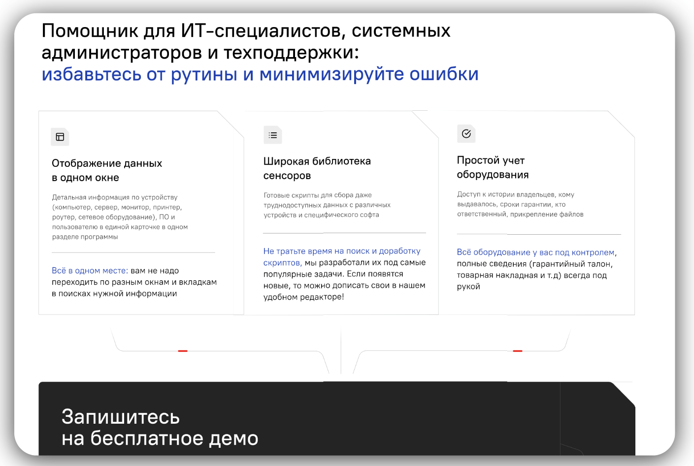 На первом экране акцентировано внимание на ключевых преимуществах и уникальных торговых предложениях. Посетители сразу видят, что программа предоставляет детальную информацию по каждому устройству, включая его конфигурацию, пользователей, установленный софт и подключенное оборудование.