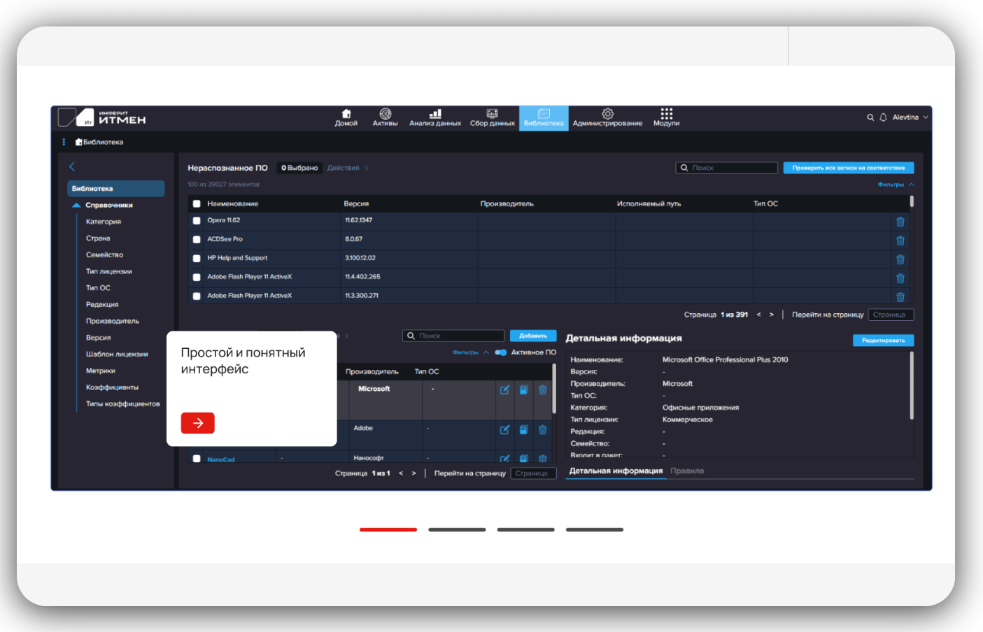 На втором экране подчеркиваются главные особенности программного обеспечения, которые раскрывают его ценность для целевой аудитории: детальное отображение информации в одном окне, библиотека готовых скриптов для сбора данных, подробный учет любого подключаемого оборудования.